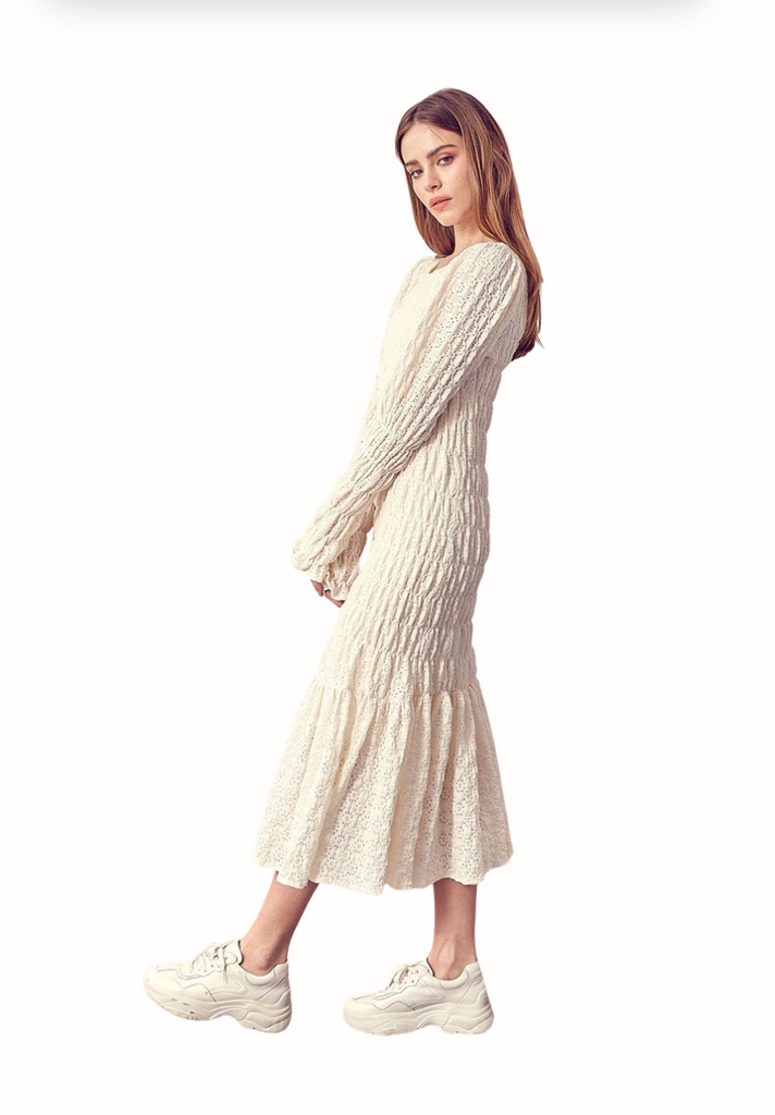 "Amoura" White Satin Deep Ruffle Hem Dress